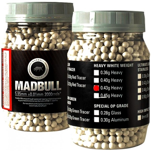 BILELE MADBULL DE 0.43 GRAME SUNT PRINTRE CELE MAI GRELE BILE DE AIRSOFT DIN PLASTIC DUR, SUNT BILE AIRSOFT PENTRU PRECIZIE, RECOMANDATE REPLICILOR AIRSOFT CARE DEZVOLTA ENERGIE MARE, AVAND O VITEZA MARE DE IESIRE A BILEI PE GURA TEVII ARMEI DE AIRSOFT. SUNT IDEALE PENTRU PUSTI SNIPER, ORICE LUNETIST PREFERAND O BILA PRECISA, CARE NU II VA DEZVALUI POZITIA IN JOC