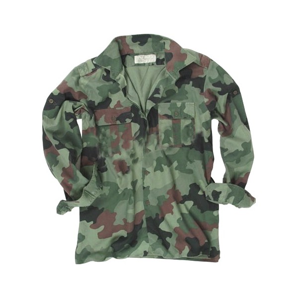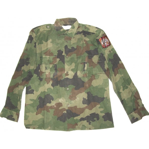 CAMASA CU EPOLETI ARMATA SERBIEI. ARE 2 BUZUNARE LA PIEPT, IAR INCHIDEREA SE FACE CU NASTURI. UNIFORMA FORTELOR ARMATE SARBE A FOST WOODLAND M89 OAK LEAF (FRUNZA DE STEJAR), INLOCUITA CU M93 SI M-MDU-02 (Maskirni Dezen Uniforme, Model 2002), AVAND ALTE NUANTE, FOLOSITE DE FORTELE SPECIALE, UNITATI ANTI-TERORISTE SAU POLITIA MILITARA COBRAS