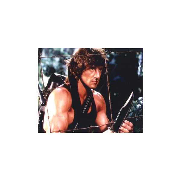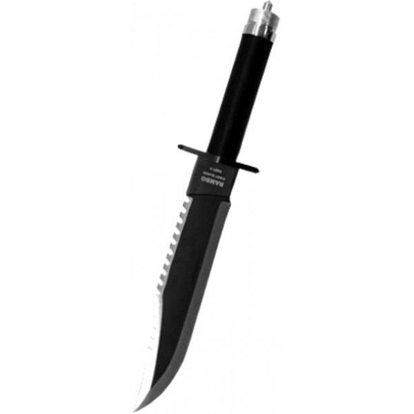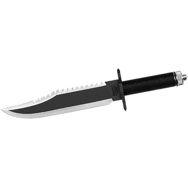 REPLICA DUPA CUTITUL FOLOSIT DE JOHN RAMBO (SYLVESTER STALLONE) IN PARTEA A DOUA DIN SERIA RAMBO. CUTITUL RAMBO 2 ESTE CONFECTIONAT DIN OTEL, GARDA MANERULUI ARE CAPETE IN FORMA DE SURUBELNITA DREAPTA SI IN CRUCE, IAR IN INTERIORUL MANERULUI EXISTA UN MIC KIT DE SUPRAVIETUIRE (PANSAMENT, CHIBRITE, GUTA, AC DE PESTE). ESTE APROAPE IDENTIC CU CUTITUL RAMBO 1, DAR ESTE MAI LUNG SI ARE LAMA MAI LATA