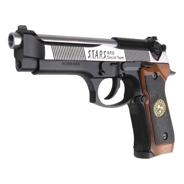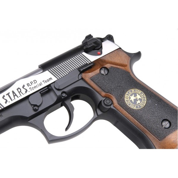 PISTOL AIRSOFT BERETTA 92 DUAL TONE STARS RPD SPECIAL TEAM – SAMURAI EDGE – BIOHAZARD, COMPLET DIN METAL (DOAR PLASELELE DE PE MANER SUNT DIN ABS CU CAUCIUC), CU SISTEM BLOWBACK SI PROPULSIE CU BUTELIE DE CO2. ESTE REPLICA DUPA BERETTA 92, AVAND LA BAZA JOCUL RESIDENT EVIL / BIOHAZARD, UNDE STARS ESTE O UNITATE SPECIALA DIN CADRUL RACCOON CITY POLICE DEPARTMENT